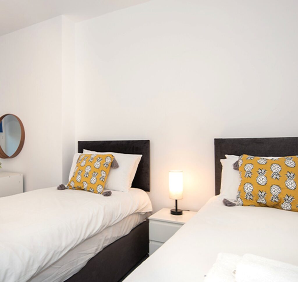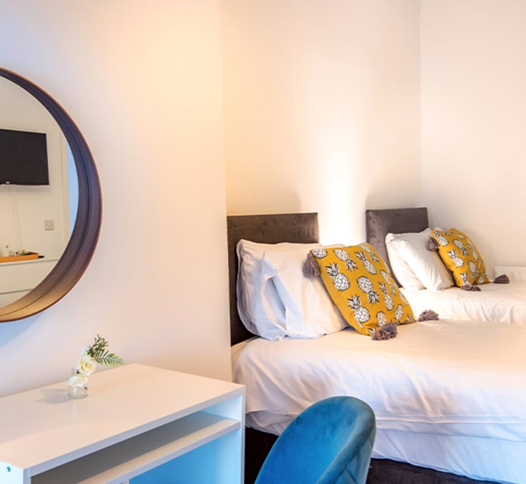 The twin rooms at the Royal Ashton Town House in Taunton offer comfortable, ensuite accommodation ideal for both short and long stays. Each room features two single beds, flat-screen Freeview TV, wardrobe, tea and coffee making facilities, and a fridge. The ensuite shower room includes complimentary toiletries, with towels and bed linen provided.